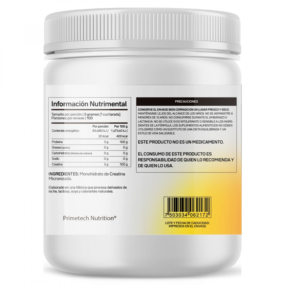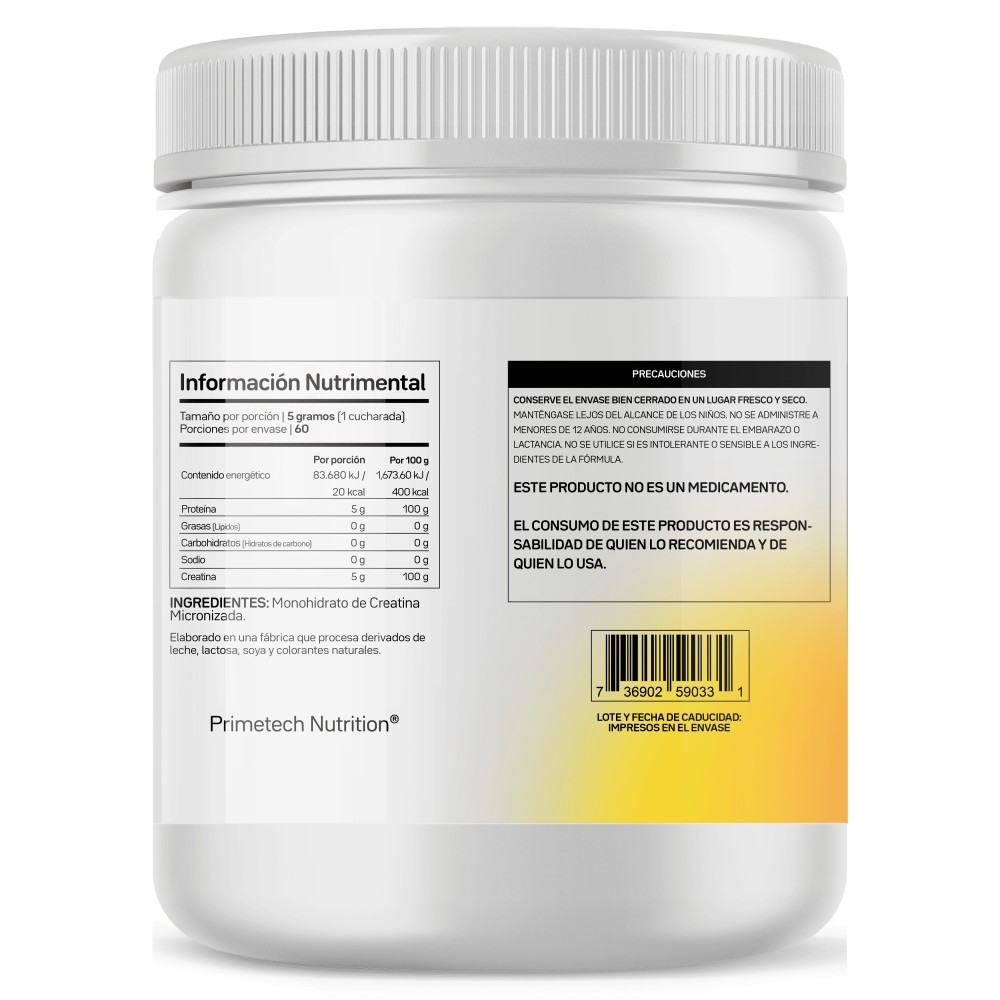 Creatina Monohidratada y Micronizada pura en polvo sin sabor o aditivos, 60 porciones, 300 gr Primetech Nutrition