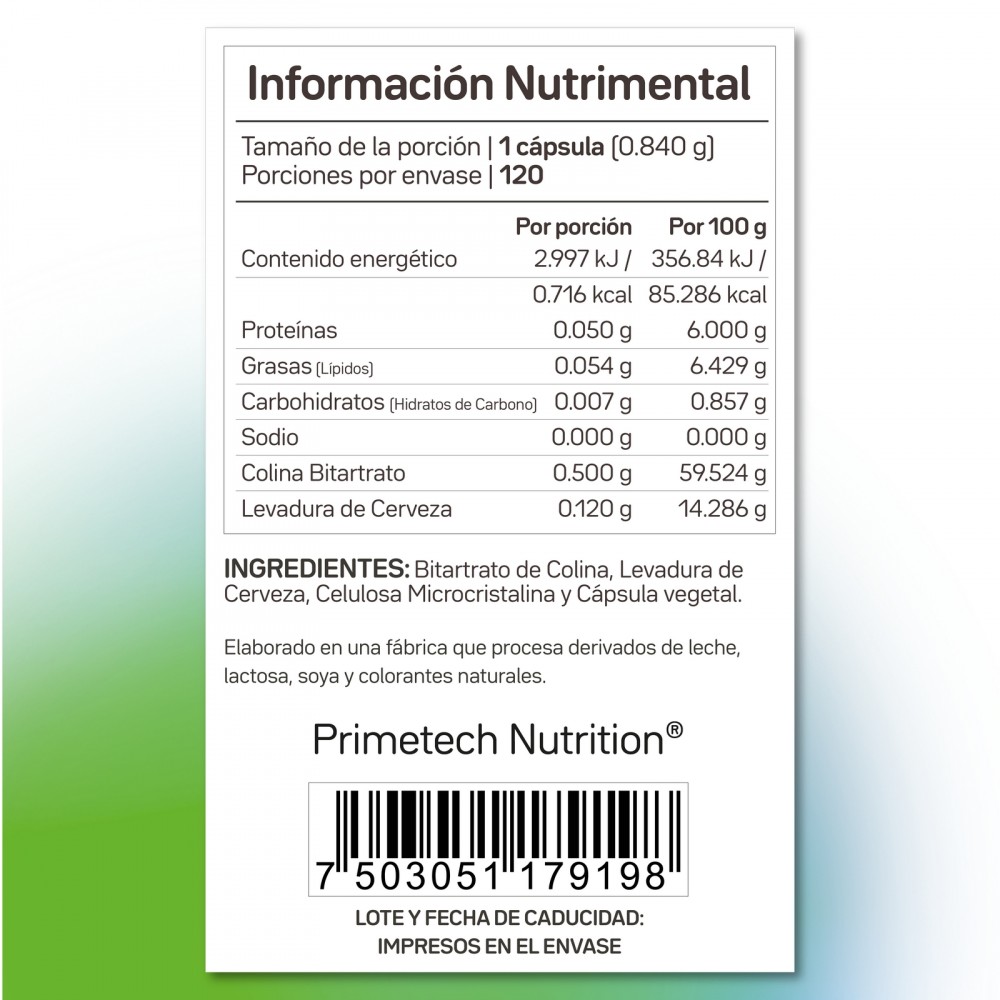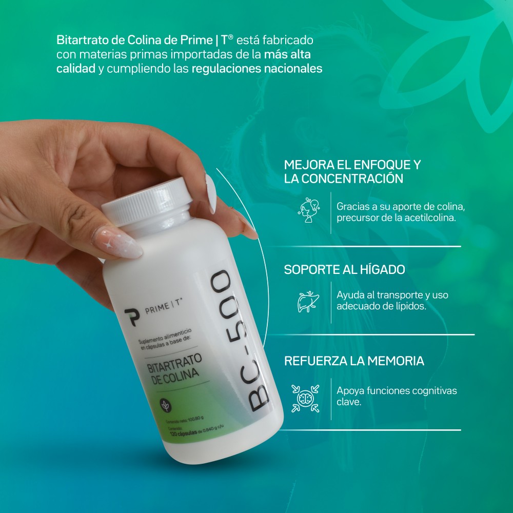 BC-500 de Primetech Nutrition es un suplemento dietético enfocado en el aporte del nutriente esencial Bitartrato de Colina, complementado con Levadura de Cerveza para un soporte nutricional adicional. La Colina es un compuesto vital para diversas funciones orgánicas, incluyendo el metabolismo de las grasas y la función neurológica.