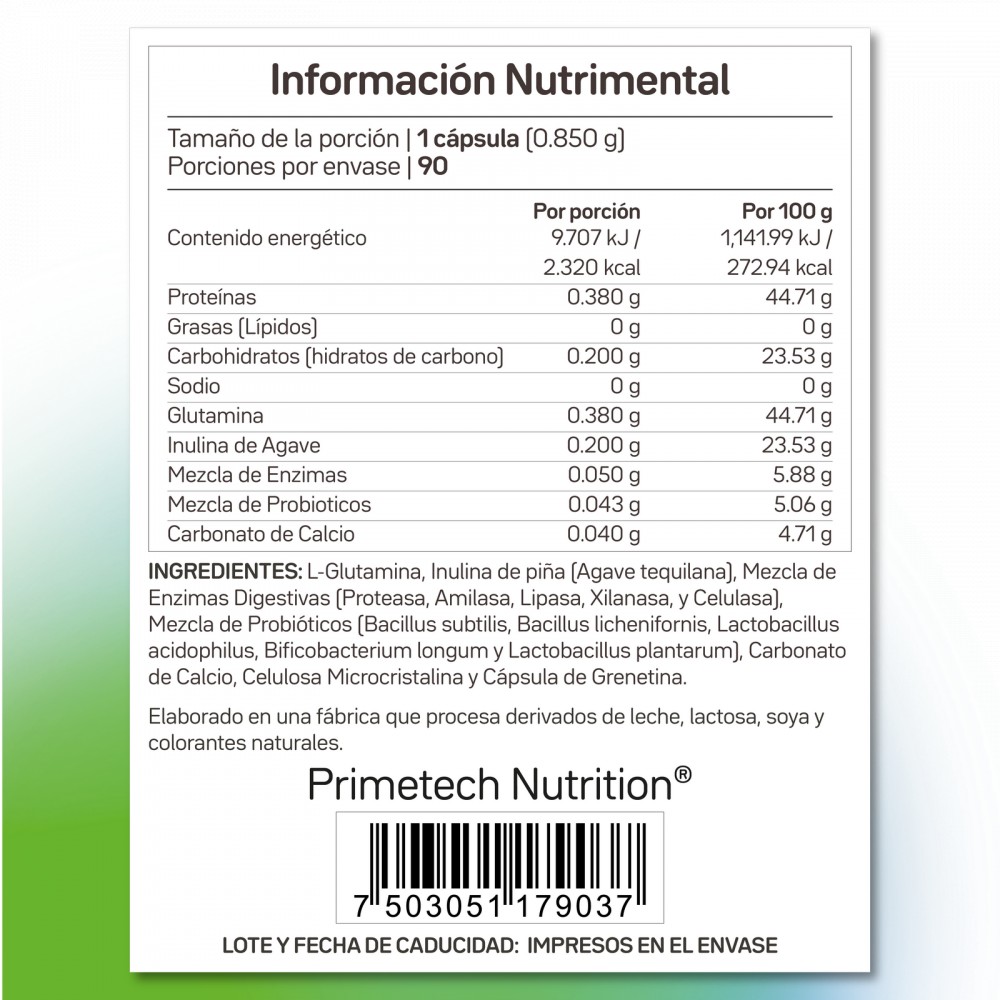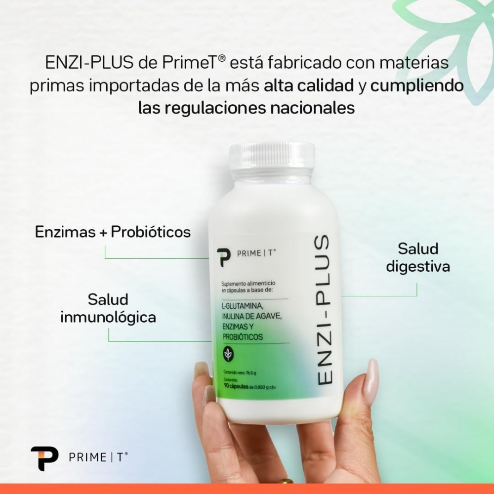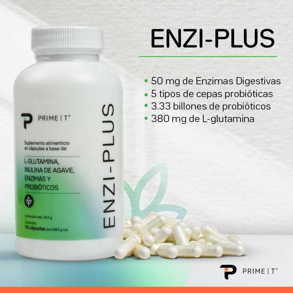 ENZI-PLUS es una mezcla de enzimas digestivas, probióticos y L-Glutamina en un envase con 90 cápsulas para 30 días.