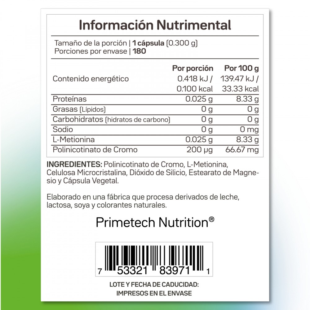 El POLINICOTINATO de cromo es de alta calidad y proviene de la mezcla de cromo con niacina del complejo B y tiene una absorción mayor al PICOLINATO de cromo, debido a que el ácido picolínico que se mezcla con el cromo para crear picolinato de cromo, no se digiere fácilmente.