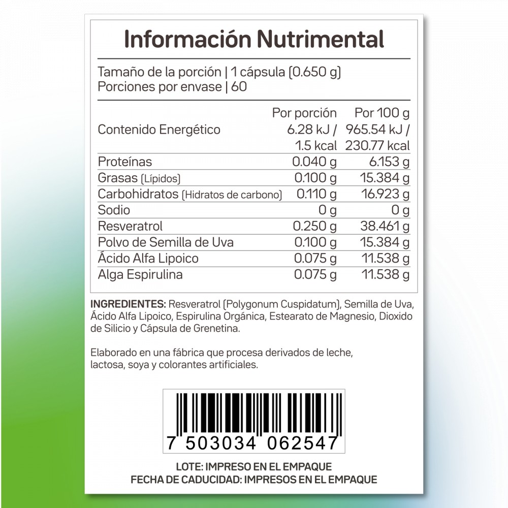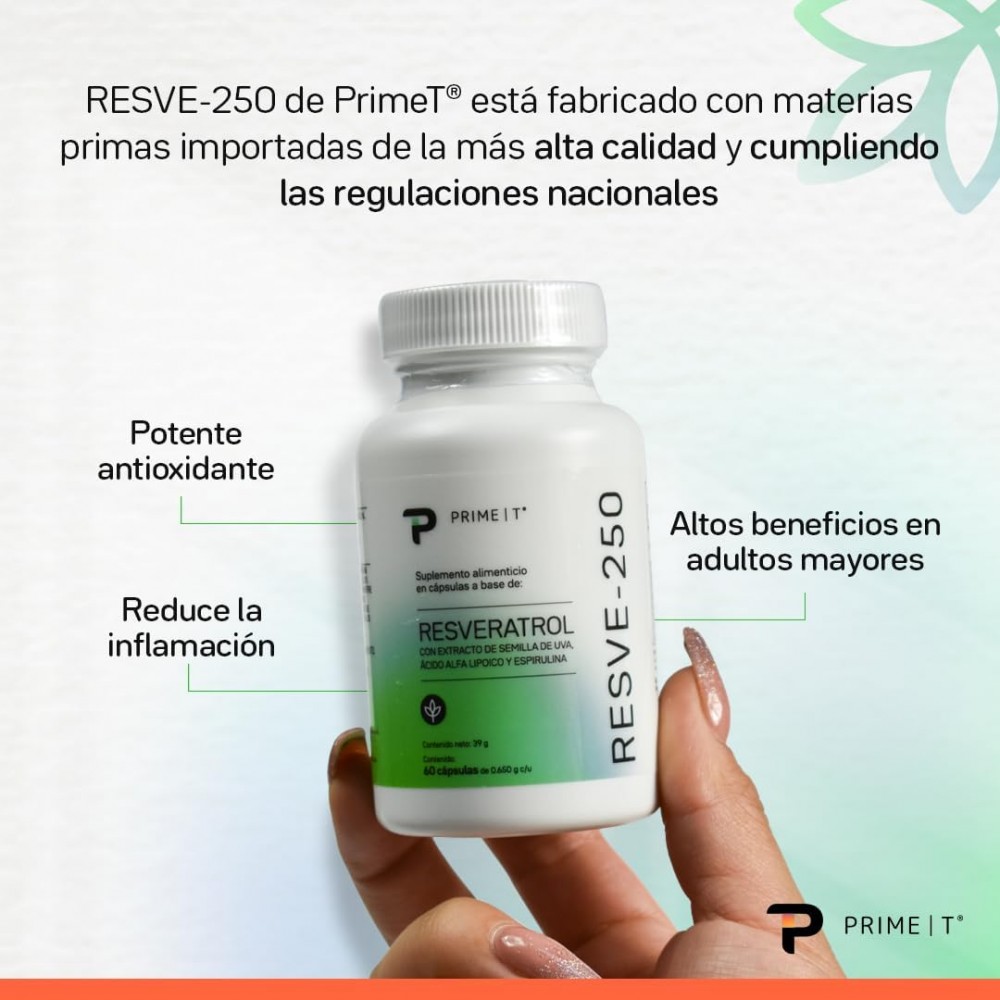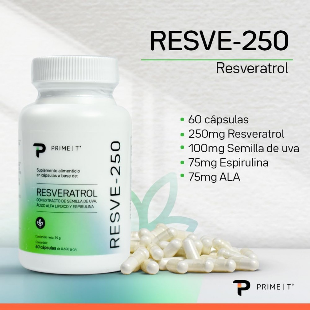 El Resveratrol RESVE-250 de Primetech contiene extracto natural de una planta asiática llamada "Polygonum cuspidatum", combinado con extracto de semilla de uva, ácido alfa lipoico y espirulina orgánica.