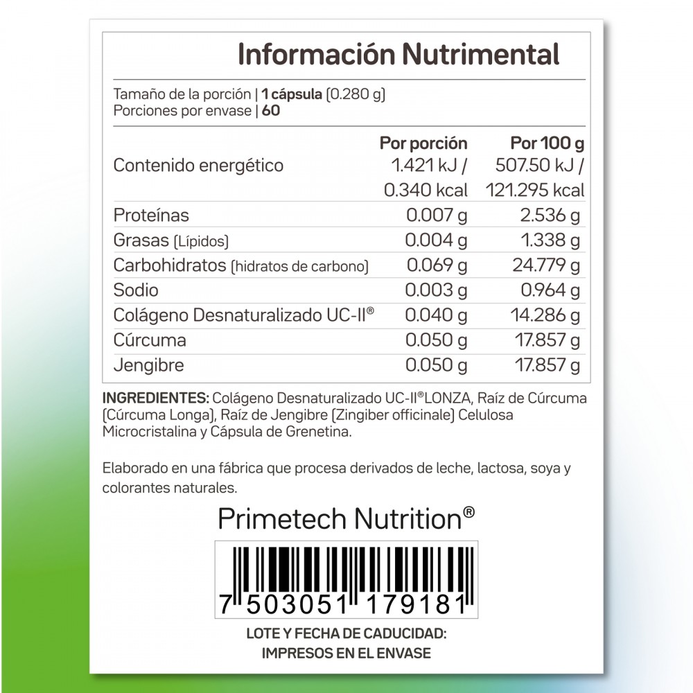 - Sinergia de Ingredientes Naturales:Combina el soporte estructural del UC•II® con los efectos beneficiosos de la cúrcuma y el jengibre, tradicionales por sus propiedades de bienestar.