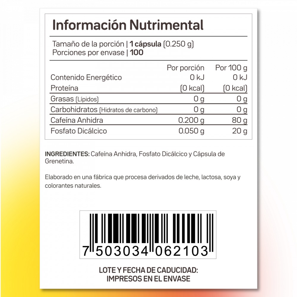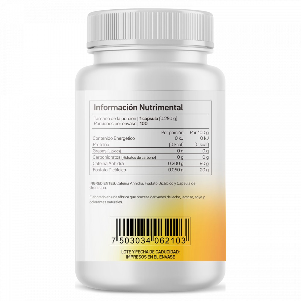 Cada cápsula contiene 200 mg de cafeina anhidra pura, sin mezclas o rellenos desconocidos, sólo cafeina anhidra de la más alta calidad. La cafeína es el estimulante mas popular del mundo con cero calorías o azúcares agregados.