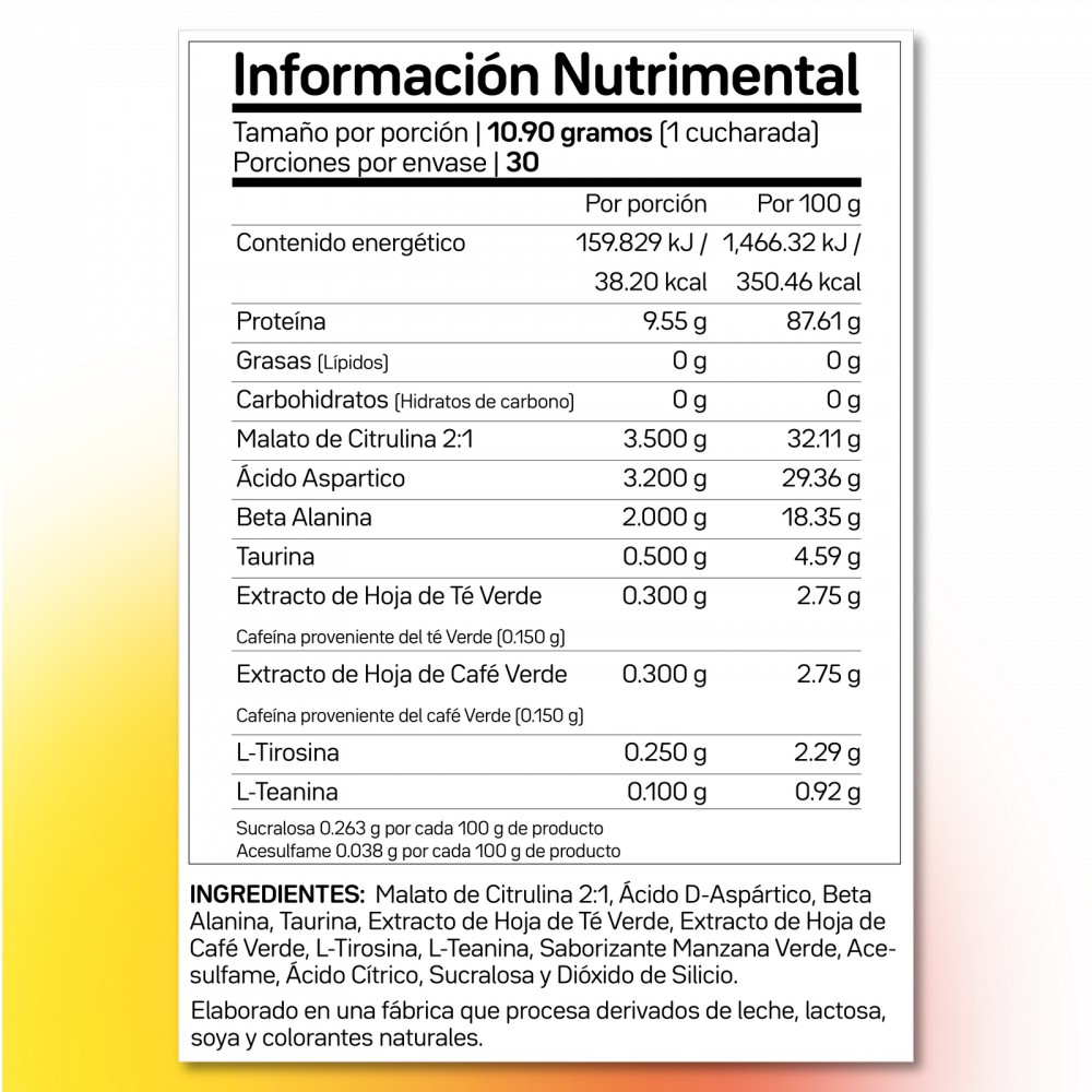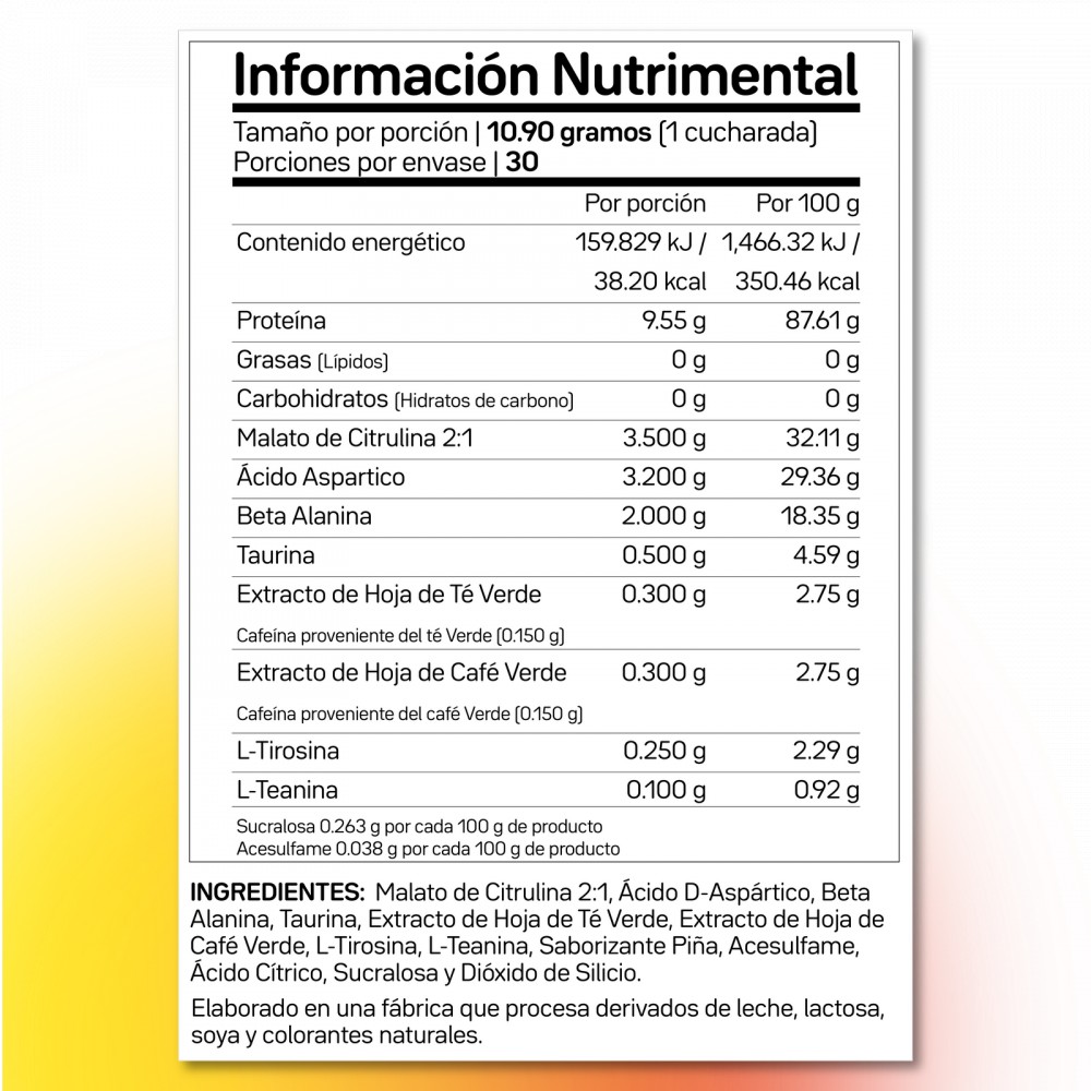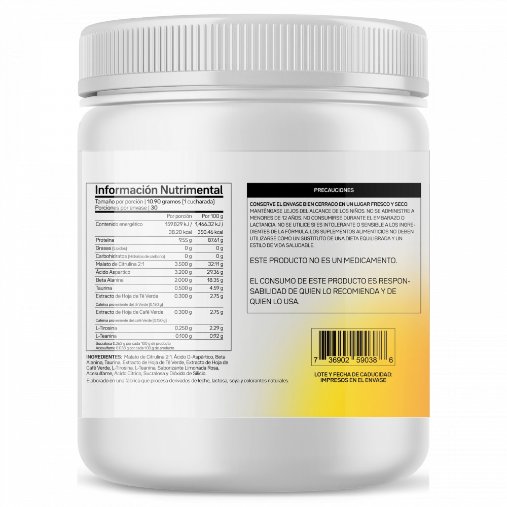La innovadora fórmula de Pre-Xplode contiene Malato de L-Citrulina, Beta Alanina, Taurina, Cafeína Anhidra, Tirosina, L-Teanina y Ácido D Aspártico