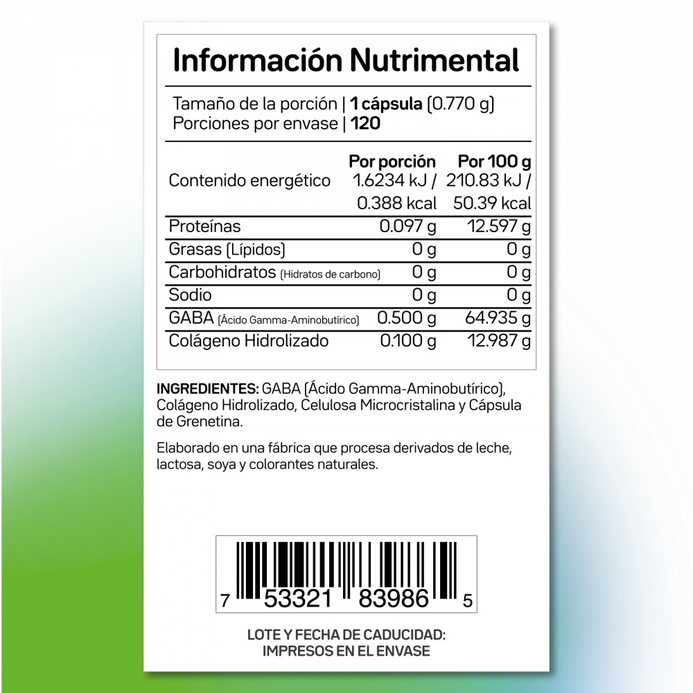 Ácido gamma aminobutírico GAB-500 envase con 120 cápsulas con 500 mg de GABA cada una. El ácido gamma aminobutírico GABA es un aminoácido natural.